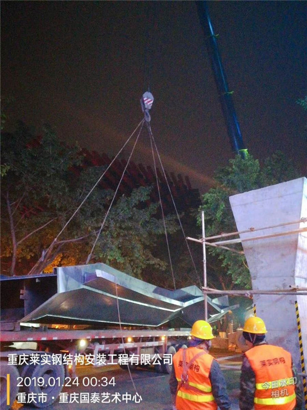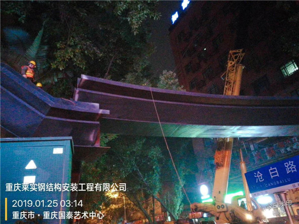 2019年1月25日,随着第三段钢梁起吊就位,由重庆莱实钢结构集团承建的洪崖洞沧白路人行天桥工程钢结构主体顺利合拢。