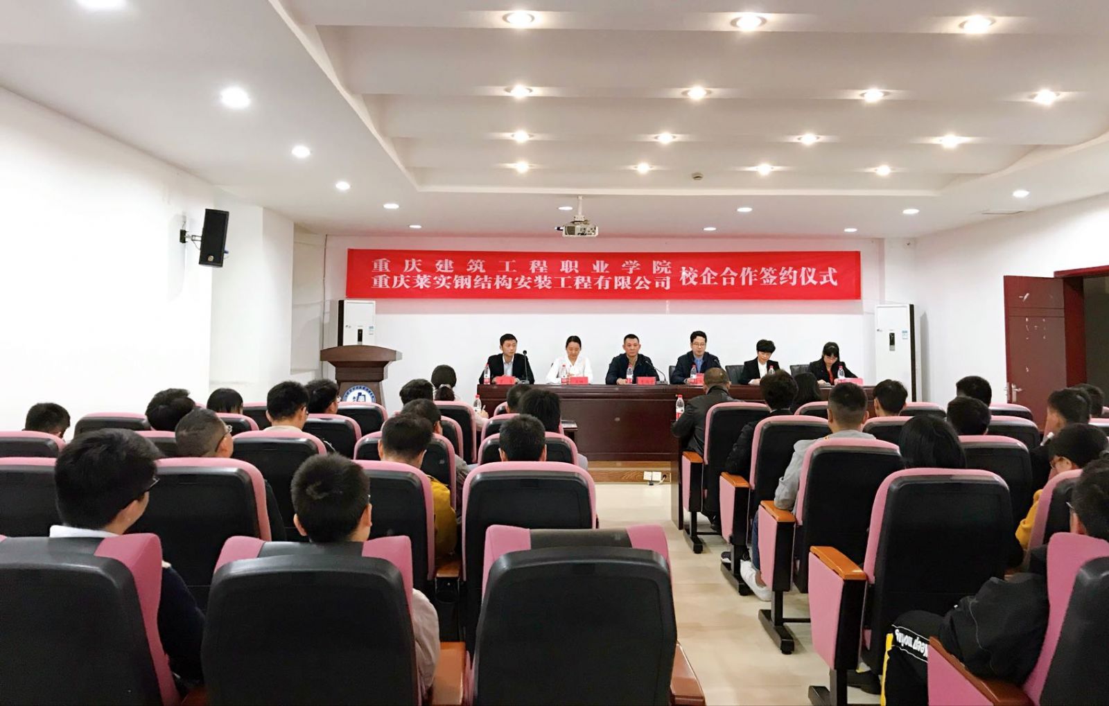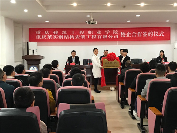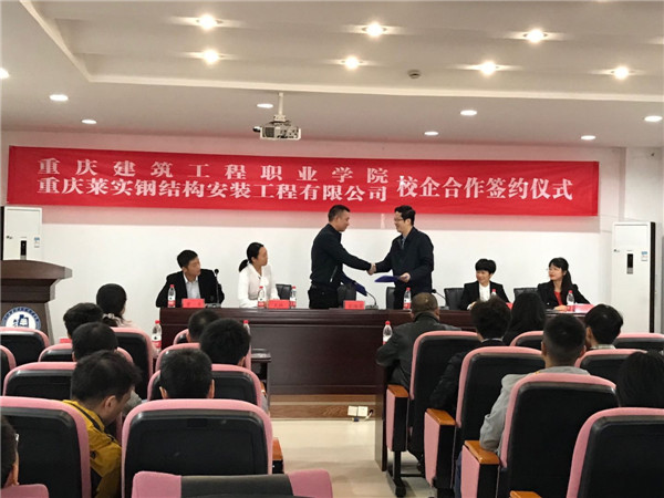 2019年10月31日,重庆莱实钢结构安装工程有限公司与重庆建筑工程职业学院在学院举行校企合作签约仪式,重庆莱实钢构集团的总经理彭路云、企管部副部长王林代表公司出席此次签约仪式,建工学院的副院长刘幼昕、招生就业处处长黄霁等各级领导及学校建筑钢结构工程技术专业全体同学出席了此次活动。