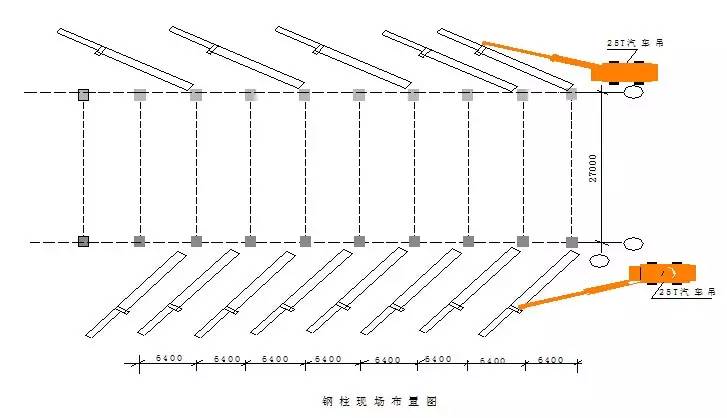 钢柱安装使用25吨汽车吊进行吊装,钢柱起吊时,吊车应边起钩,边转臂,使钢柱垂直离地。