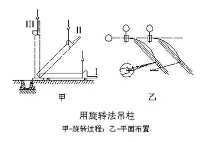 旋转法要点: 起重机边起钩边回转使柱子绕柱脚旋转而吊起柱子的方法叫旋转法,如下图甲所示。用旋转法吊装柱子时,为提高吊装效率,在钢柱进场时,应使柱子的绑扎点、柱脚中心和杯形基础中心三点,在以起重机停点为圆心,停点至绑扎点的距离(即吊柱子的回转半径)为半径的圆弧上(简称三点一圆弧),如下图乙所示。