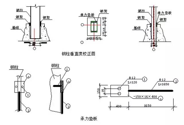 ·钢柱垂直度校正:采用调距丝杆和钢楔,由于柱子长边接触面小,施工中设置垫板,详图如下。