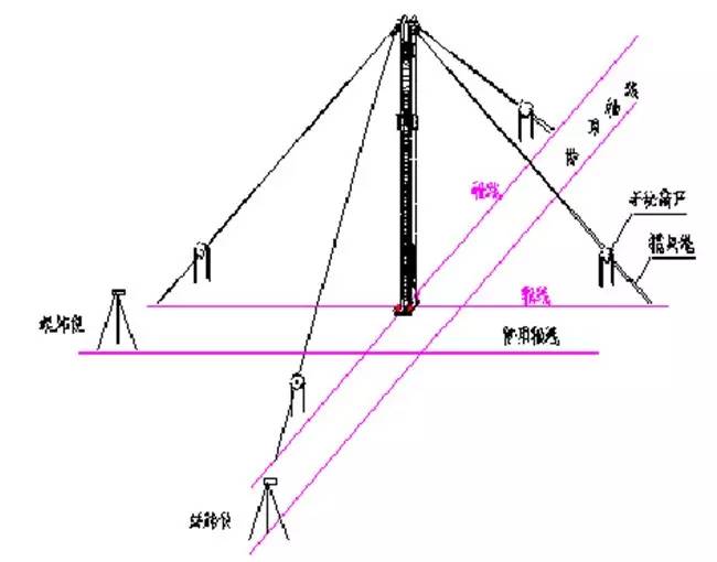 毕形成整体后即可插入测量校正。用两台经纬仪从柱的两个侧面同时观测,使用揽风绳进行校正调整。