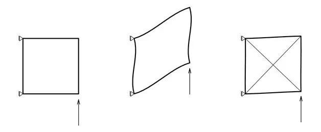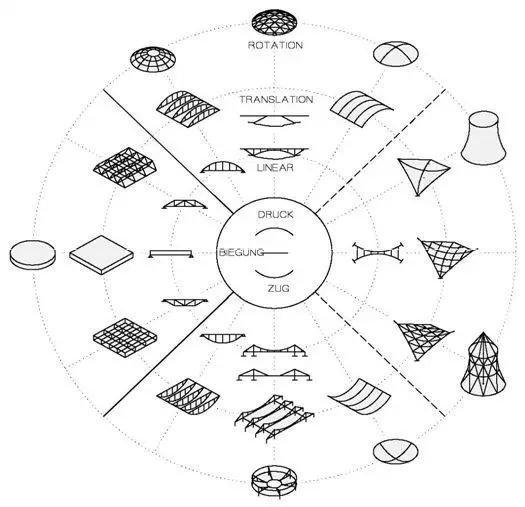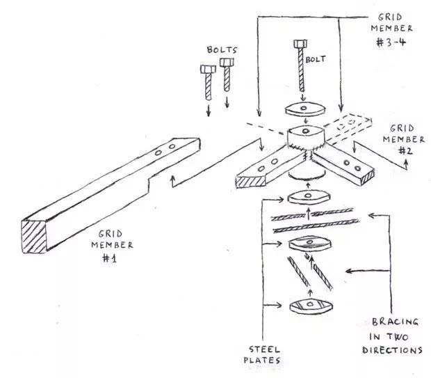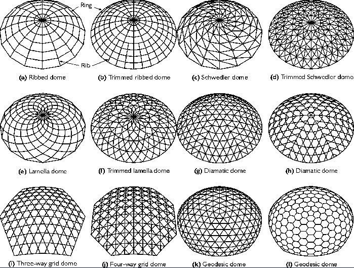提高平面内刚度的直接方式是采用三角形网格。富勒发明了短线呈穹顶,并应用于1967年蒙特利尔国际博览会上的美国馆——一座直径为76m的3/4球形建筑。