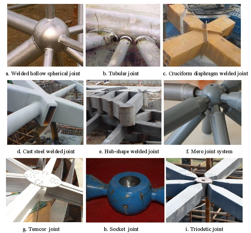 罗马尼亚布加勒斯特穹顶1961年建成,跨度约93.6米,矢跨比约1:5。钢管杆件构成的单层网壳,网格呈等边三角形式,支承在沿圆形周边布置的混凝土柱上。在网格的节点处有三个方向钢管汇交,如何连接?
