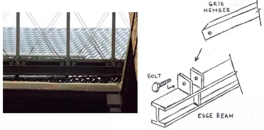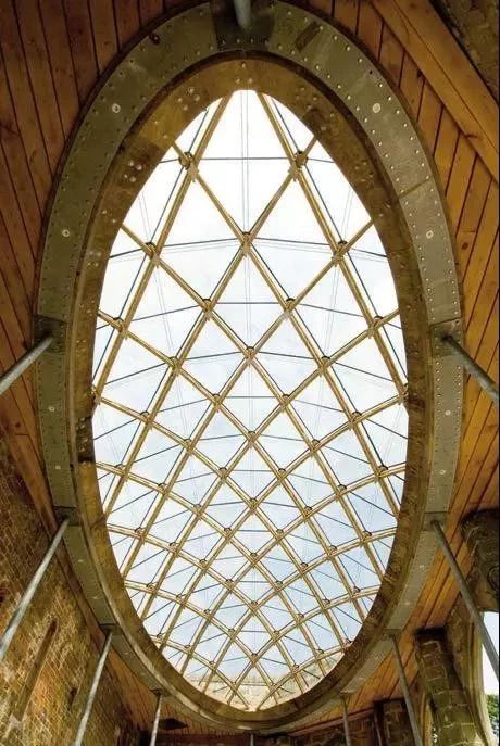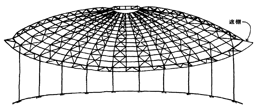 这是一个古老的铸铁网壳,建于19世纪后期。可以看出,这个网壳没有斜杆,它是利用杆件的抗弯能力来抵抗平面的扭转。
