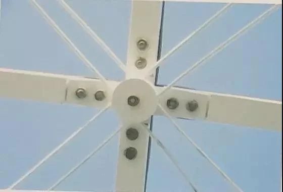 杆件通过螺栓与中间圆柱形节点相连,正交拉索连接网格的对角节点,以增加网格刚度。拉索不仅增加了刚度,也减小了杆件承受的弯矩。