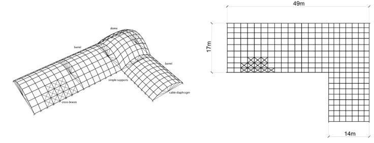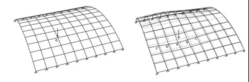 屋面结构在L形的两部分采用了单曲的筒壳,交汇处采用了双曲壳体。壳体采用四边形网格划分,这样的网格划分形式可以看作一榀榀拱排列着,拱之间用纵向用杆件联系。