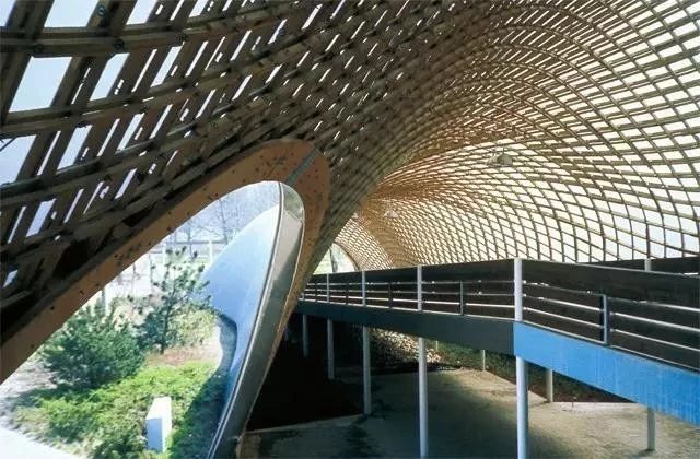 2000年,奥托和与坂茂合作了汉诺威世博会日本馆,采用了与曼海姆大厅类似的网壳结构,只是屋面网格的木材换成了纸卷。